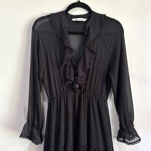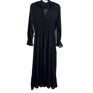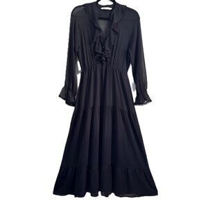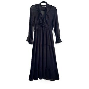 Zara | Chiffon Tiered, Ruffle collar V-neck Maxi Dress Black | SZ Small Women's