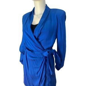 Super flattering wrap dress. Inner tie + outer tie to make it extra flattering! Deep v-neck dress with a draped collar. Shoulder pads for dramatics!