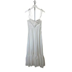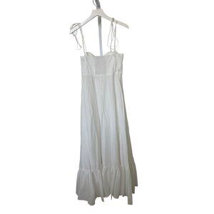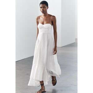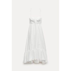 Elevate your wardrobe with this elegant Zara dress, crafted from 100% cotton poplin for breathability and comfort. The timeless white hue and ruffled hem offer a sophisticated yet playful touch, while the sweetheart neckline and adjustable tied straps ensure a flattering fit, making it an ideal choice for warm seasons.