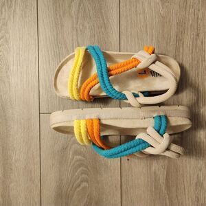Vibrant Zara sandals with braided straps. Features yellow, orange, and teal accents. Ideal for casual outings.