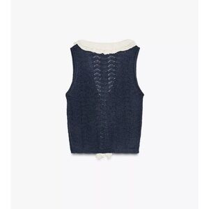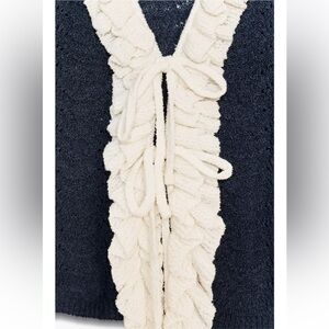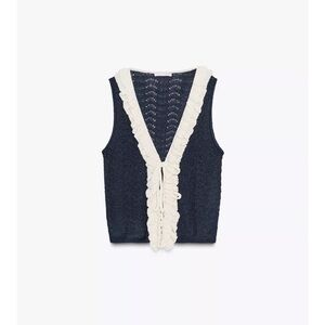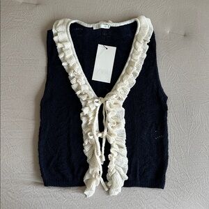 V-neck sleeveless top. Contrasting ruffle detail. Front tie closure.