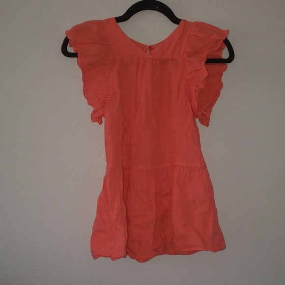Adorable coral dress with ruffle sleeves. Ideal for casual outings. Soft fabric ensures comfort.