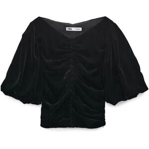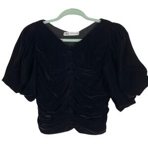 Zara Corie Black Velvet Top XS Puff Sleeve Button Detail Cropped Bloggers Fave