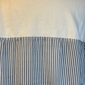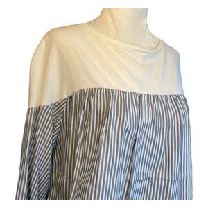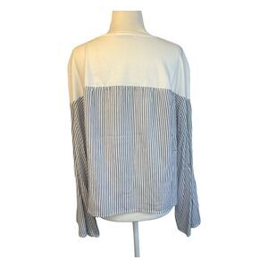 Zara Color Block Top featuring a Solid White Top Half Cotton Knit and Blue and White Stripped Flowy Poplin Knit Lower Half. It has Long Bell Sleeves, a Round Neckline and is a Pull-Over style.