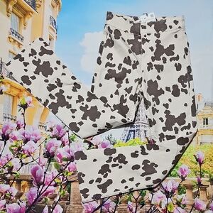 Stylish cow print high-waisted jeans. Perfect for a bold look. No material tag. stretchy material