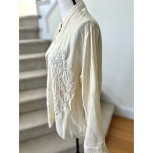 Excellent condition. Cream long sleeve button up blouse. The seam with the buttons is the portion that is asymmetric. Accented cream floral paisley beading across the chest.