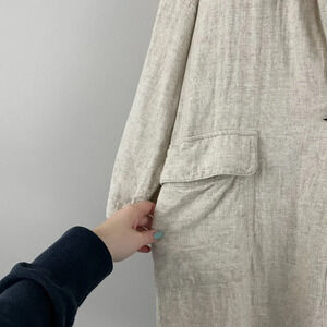 Features: long sleeve, collared, front patch pockets, single button closure, oversized, lagenlook, resort, beachy, unlined, linen blend