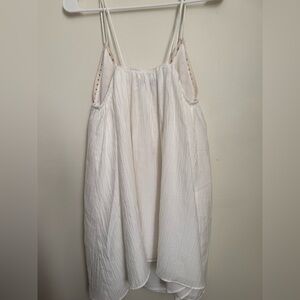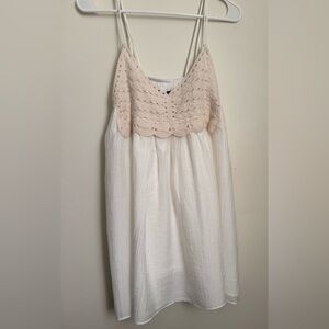 Chic cream mini dress with crochet top. Perfect for summer outings.