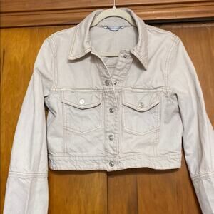 This chic cream jean jacket from Zara offers a modern twist with its cropped design and classic denim construction. Its versatile style makes it a perfect addition to any wardrobe, effortlessly elevating your look.