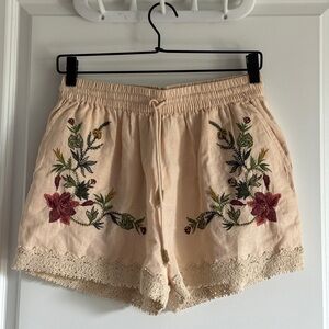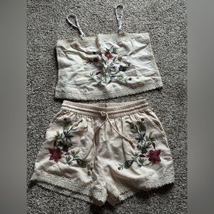 Elegant cream set with floral details. Includes a sleeveless top and shorts. Ideal for summer outings.