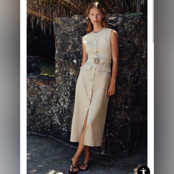 Elegant cream midi dress. Features a belted waist and button-down front. Sleeveless design for a chic look.