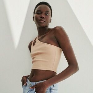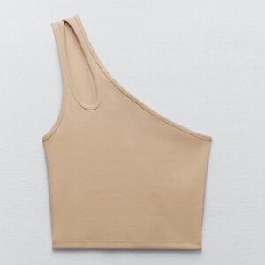 Stylish one-shoulder ribbed tank top in a soft tan color. Perfect for casual wear.