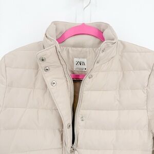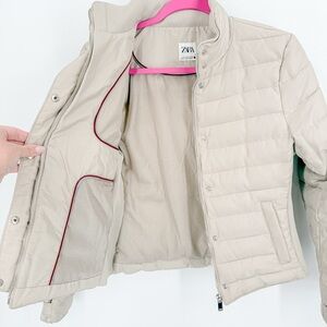 This cream puffer jacket from Zara showcases a stylish quilted design and a standing collar, providing a chic and cozy option for cooler weather. Its fitted silhouette and minimalistic style make it a versatile addition to any wardrobe.