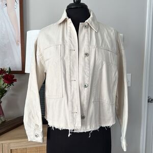 Zara Cream Raw Hem Cropped Boxy Denim Jacket