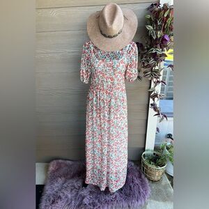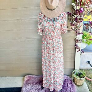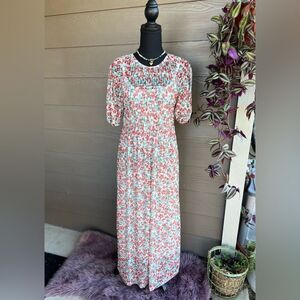 Zara Cream Red Floral Smocked Mesh Prairie Cottagecore Boho Maxi Dress Sz S