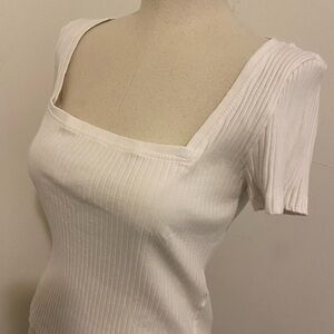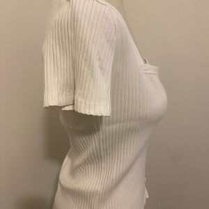 Elegant cream ribbed blouse with square neckline. Features short sleeves. Perfect for any occasion.