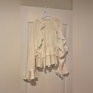 Elegant cream blouse with ruffled details. Long sleeves with flared cuffs. Perfect for a chic look.