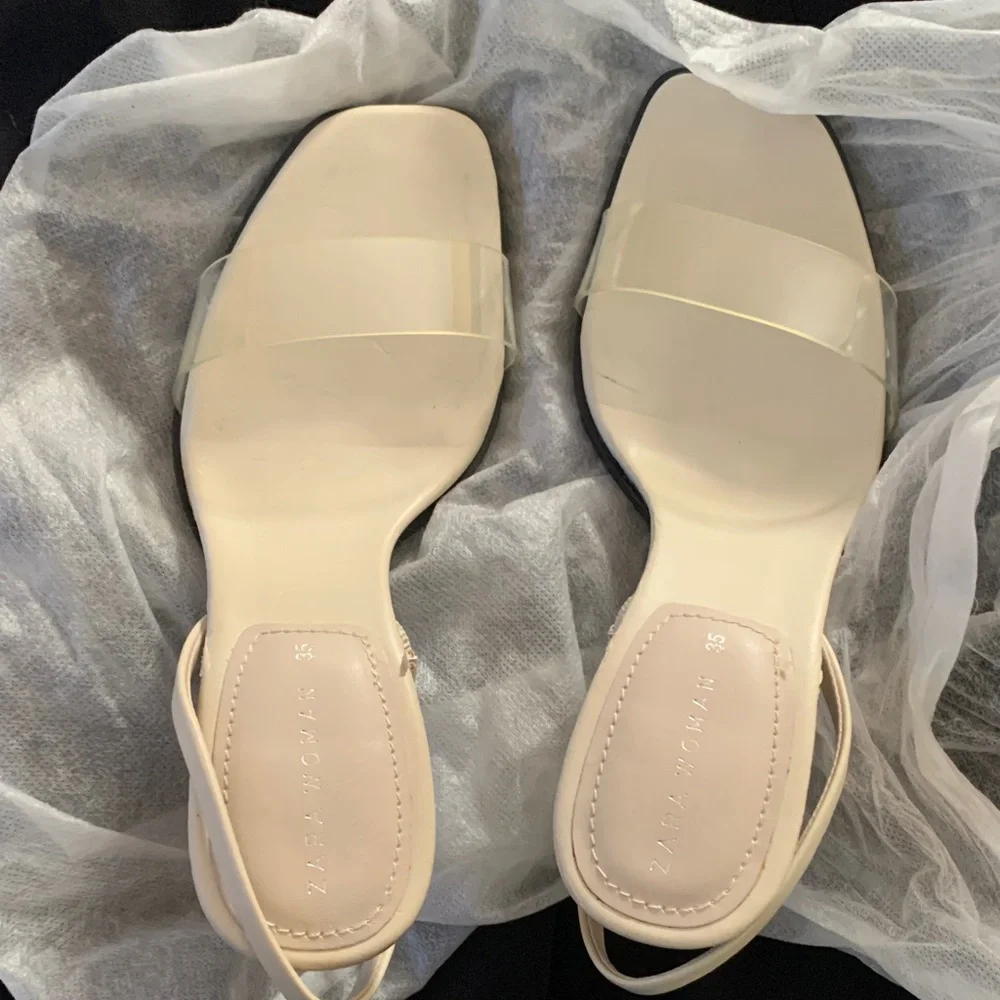 Zara Cream Square-Toe Clear Strap Slingback Sandals