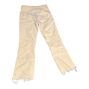 Chic wide leg jeans in cream. Frayed hem adds a trendy touch. Perfect for casual wear. Size 1