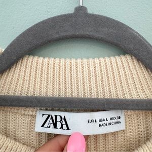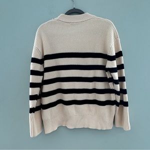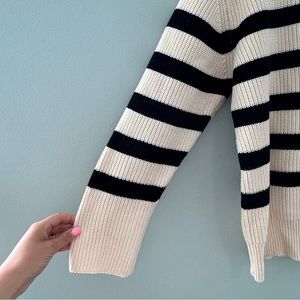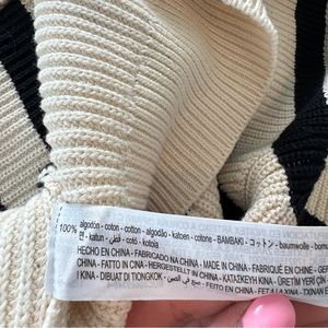 Stylish crew neck sweater. Cream base with black stripes. Ribbed texture. Perfect for casual wear.