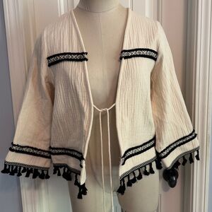 Stylish cream blazer with black tassel details. Open front design. Perfect for layering.