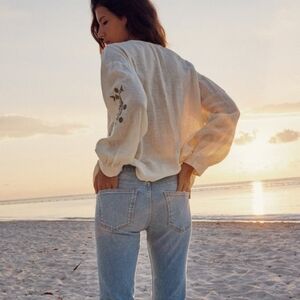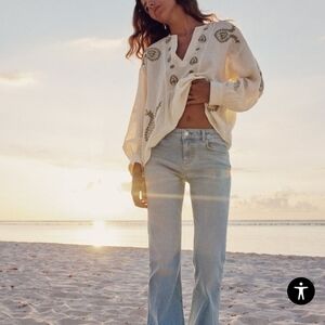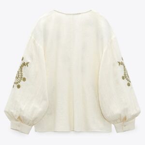 Elegant cream top with green embroidery. Long sleeves. Relaxed fit. Perfect for casual outings.