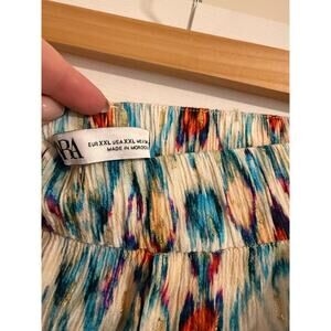 Crinkle colorful material, with gold shining through. Cropped top with tie, rubberband waist cropped pants with pockets. Very thin material, soft & comfortable.