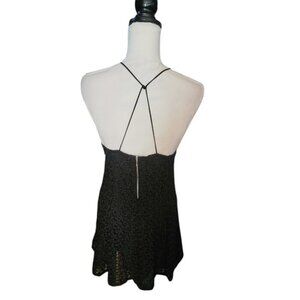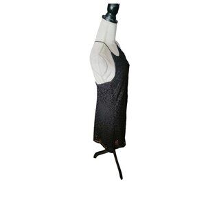 Great party dress in black with crochet overlay and lining underneath. Zipper up the back and cris cross spaghetti strap. Slight swirl to the skirt. Made in Turkey.