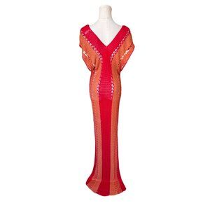 • Maxi Crochet Summer Knit sexy slinky feminine orange red striped colorblock long deep v neckline resort wear beach cover up ocean vacay vacation party elegant colorful bright unique statement avant garde long maxi