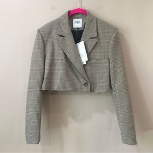 Zara Crop Blazer Jacket Plaid Tan Brown Boxy Blogger Preppy Size XS