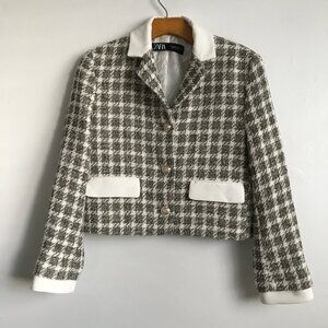 Zara Crop Boxy Blazer Jacket Gray Check Womens Small