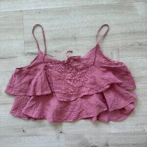 Zara pink ruffle cami top in a lightweight linen blend, perfect for warm weather and festival season. Size Medium. Features adjustable tie-back straps, layered ruffle detail, and a breezy, flowy fit. Feminine and flattering, this top pairs effortlessly with jeans, shorts, or skirts for a casual yet stylish look.