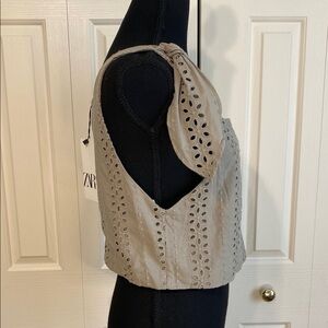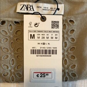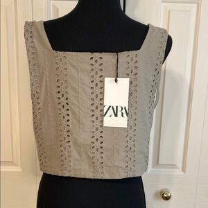 Title: Zara Crop Top Prairiecore Eyelet Sleeveless Shoulder Tie Khaki Green Size Medium NWT Description: Keywords: Zara crop top, khaki green, prairiecore, eyelet lace, sleeveless blouse, tie shoulder straps, square neckline, cotton top, summer fashion, neutral tone, romantic top, resort wear, feminine style, casual chic, cottagecore, minimalist neutral, warm weather outfit, boho-inspired, soft cotton eyelet, breathable New With Tags Zara khaki green eyelet crop top featuring a square neckline, adjustable tie shoulders, and a delicate embroidered eyelet design. Made from lightweight cotton with a breezy, structured silhouette perfect for warm-weather styling. The soft neutral tone and cropped cut make it an effortless pairing with high-rise jeans, skirts, or linen pants for a clean, feminine, and versatile look. Measurements (approximate): Pit to Pit: 18” Length: 16.5” Details & Features: Size: Medium Color: Khaki green Material: 100% Cotton Condition: New with tags Style: Sleeveless eyelet crop top Features: Adjustable shoulder ties, square neckline, airy cotton eyelet fabric, cropped silhouette Perfect for: Summer vacations, brunches, beach days, or casual outings. Fast shipper — usually same or next business day. Smoke-free, pet-free home. #Zara #EyeletTop #Prairiecore #Cottagecore #SummerStyle #NeutralTone #CottonTop #SleevelessTop #CropTop #ResortWear #MinimalistStyle #BohoChic 401125491766r521014
