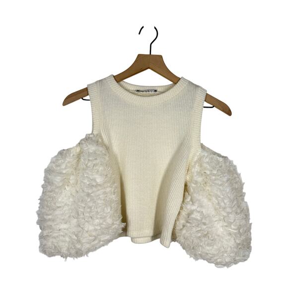 Zara Crop Top Size Small Cream Crew Neck Ribbed Cold Shoulder Boho Fluffy Sleeve