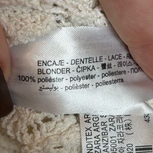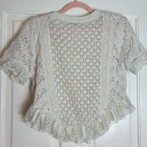 This vintage ivory top is a must-have with its crochet design, ruffle hem, and elegant mesh netting adorned with a delicate floral pattern and eyelets. Perfect for a stylish look that will turn heads.