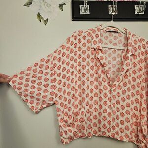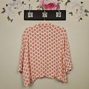 Floral boho print with a boxy oversized fit. Can fit a large as well. Slouchy front pockets with a button up front.