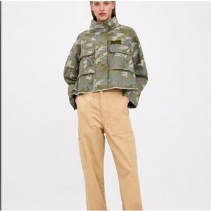Zara Cropped Green Raw Hem Velcro Pocket Camo Print Army Utility Jacket (Sz M)