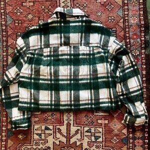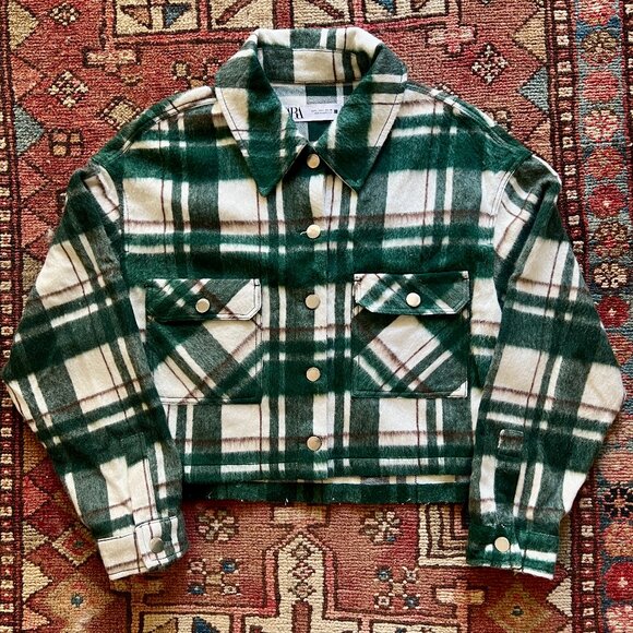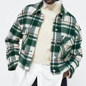 Zara Cropped Green and White Plaid Flannel Jacket, L
