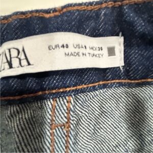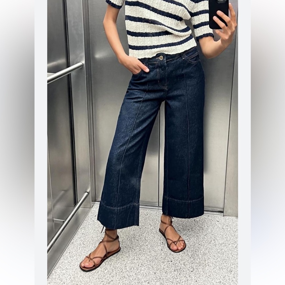Zara wide leg cropped dark wash jeans. Front seam detail. Zipper fly with button closure. Size 8. Like new.