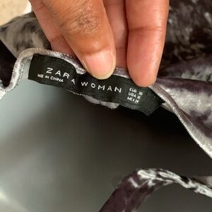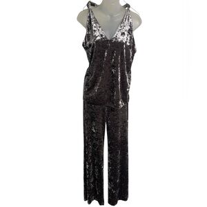 This Zara crushed velvet 2-piece set features a chic and comfortable halter-style cami top paired with matching high-waisted flared pants. The soft, silver-grey crushed velvet fabric offers a luxurious texture with a subtle shimmer, perfect for lounging in style or dressing up with heels and accessories. The relaxed fit and fluid silhouette create an effortlessly glamorous look ideal for evenings out or upscale loungewear.