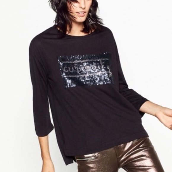 Zara "Curiosity" Sequins Tee. Navy w Silver embellishment. Medium. 3/4 Sleeves. Sequin rectangle is cute and in tact still. Round neck top with uneven hem. Excellent used condition. Approx. measurements laying flat: 19.5” pit to pit, 23” front/25" back length, 15” sleeve. Super cute. Interior material tag removed. It's likely a cotton/polyester/rayon blend. Some nice stretch to it and super smooth.
