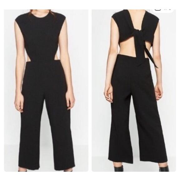 Zara Cut Out Jumpsuit L Black Side Zipper Wide Leg Tie Back Sleeveless Modern Chic.
