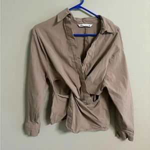 Zara Cut Out Knotted Shirt Taupe Size Small Top Twist Front Minimalist