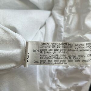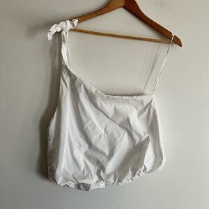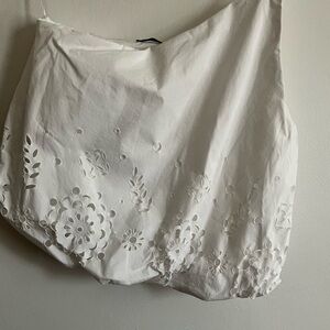 Crisp and airy white one-shoulder top from Zara featuring charming floral eyelet embroidery. Adjustable tie strap on one side and elastic hemline for a balloon-style silhouette. Fully lined for coverage. Made in Portugal from 100% cotton.