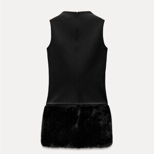 Sleeveless mini dress with round neckline. Tonal faux fur appliqué detail. Matching interior lining. Invisible back zip closure.