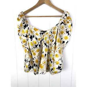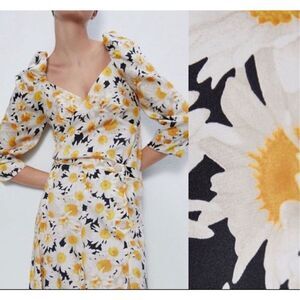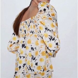 Zara Daisy Pattern Peasant Blouse Floral V Neck Puff Sleeves Size S