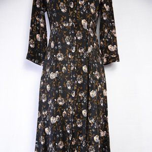 A black midi dress with a dreamy dandelion print, this airy dress features hidden small buttons that button all the way up. Sleeves are ¾ style. Dress falls past the knees, unless you are short like me (4 11”) it will fit like a maxi dress close to the ankles. Also has pockets. Size extra small. Length 51” Sleeves 17” Waist 13” Pit to Pit 15.5” Shoulder 13.5”