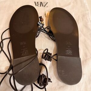Elegant dark brown leather sandals by Zara. Features stylish gold accents and intricate lace-up design.