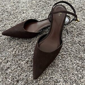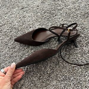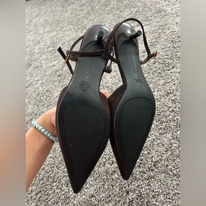 Chic dark brown heels with a pointed toe. Sleek design by Zara. Ideal for elegant outings.