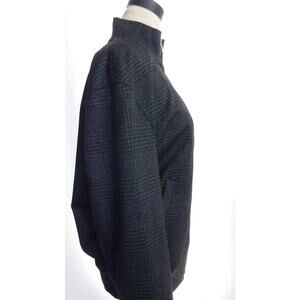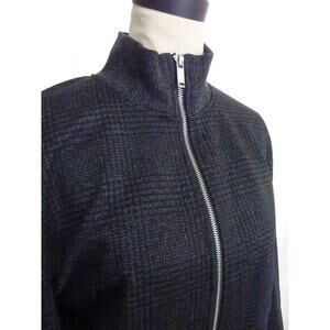 Sleek dark plaid zippered jacket. Ribbed mock neck collar. Inside lining. Side pockets have snap button closures. Excellent like new preowned condition.